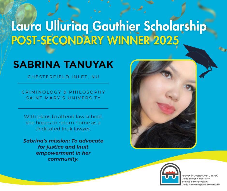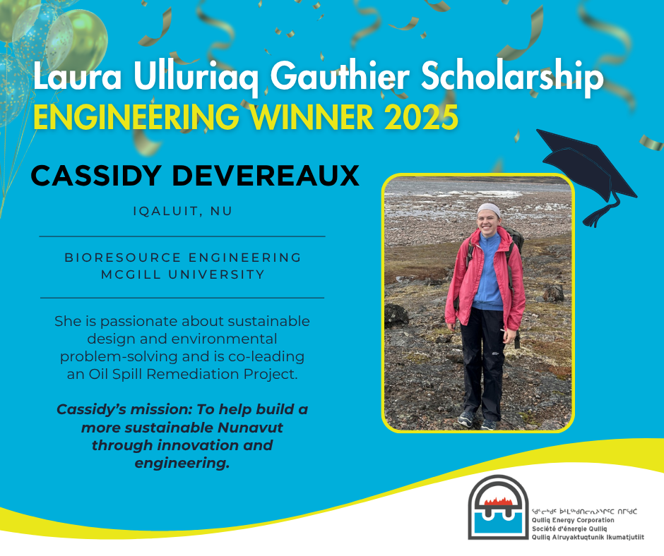 This scholarship honours the legacy of Laura Ulluriaq Gauthier, a respected community leader who contributed to the creation of a locally controlled electrical utility in Nunavut. QEC continues to invest in students who demonstrate not only academic excellence, but a passion for contributing to Nunavut’s success.